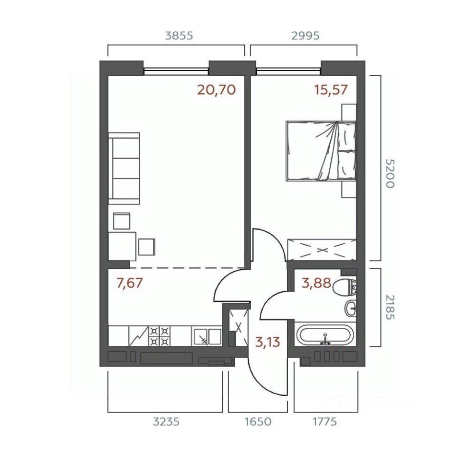 Общая площадь50,95 м²