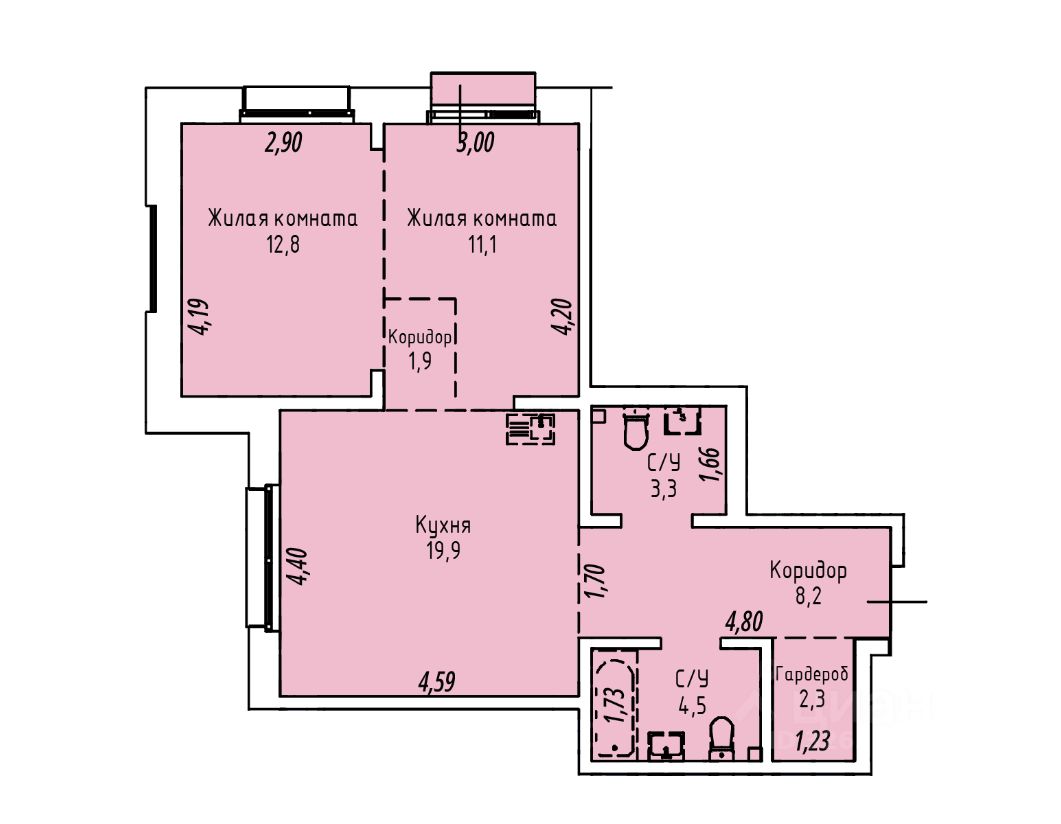 Классическая двухкомнатная квартира с двумя спальнями и большой 20-метровой кухней-гостиной.