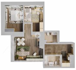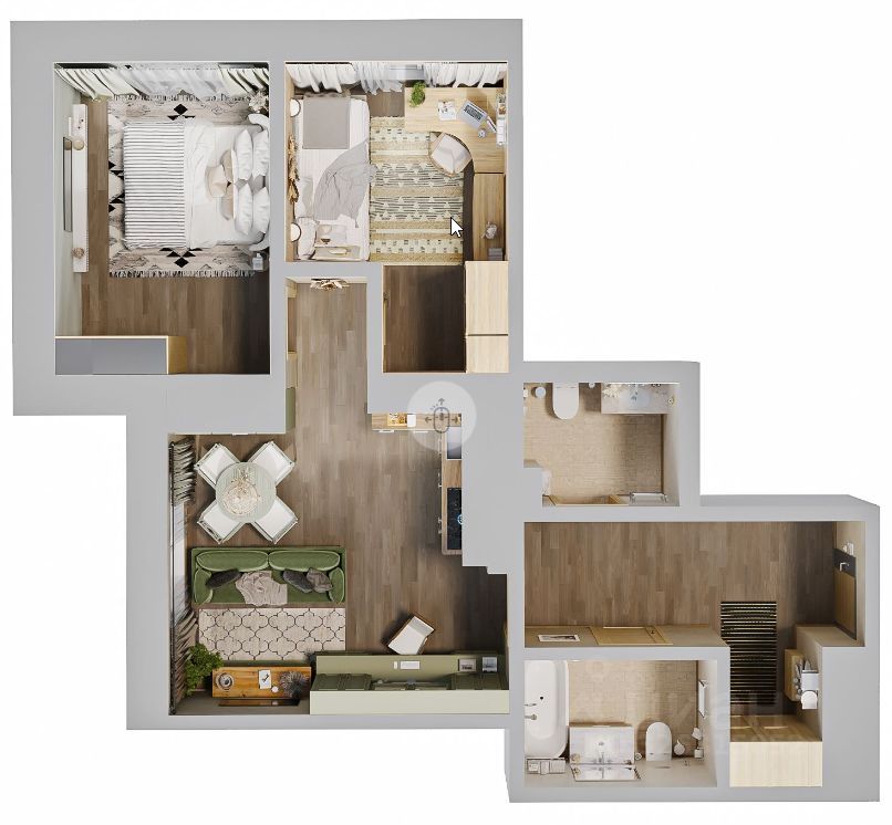 Классическая двухкомнатная квартира с двумя спальнями и большой 20-метровой кухней-гостиной. В прихожей предусмотрена возможность создать гардеробную комнату. Площадь коридоров позволяет установить несколько шкафов-купе для сезонных вещей. При входе располагаются два раздельных санузла друг напротив друга. В гостиной есть возможность выгородить нишу для кладовой и хранения габаритных вещей. Гостиная располагается на южной стороне дома, спальные комнаты — на западной, что подарит обладателям квартиры много солнечного света на протяжение всего года.
