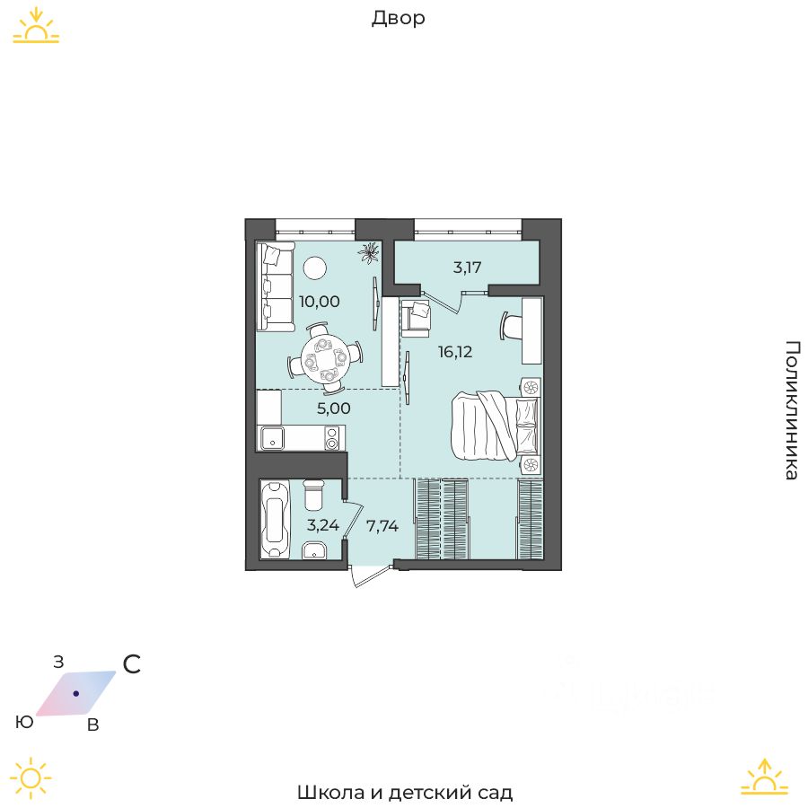 До ближайшего детского садика "Луговое", расположенного в соседнем ЖК, всего несколько минут неторопливой ходьбы. Это сад комбинированного вида, где при необходимости с детьми работают логопеды. Ближайшие школы расположены уже в черте города, но всего в 2-2,5 км от ЖК. Дорога займет примерно пять минут на машине или до двадцати минут на автобусе.