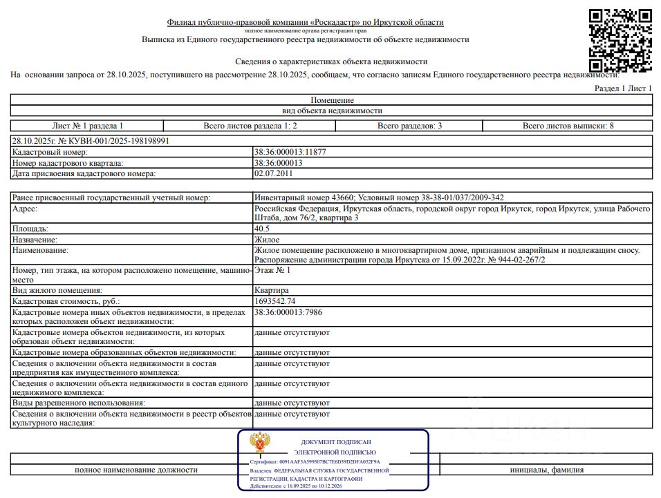 Сведениями о фактическом состоянии объекта недвижимости, о задолженности по коммунальным платежам и взносам на капитальный ремонт, об обременении третьих лиц в виде сохранения права пользования объектами организатор торгов не располагает.Зарегистрирован один человек.
