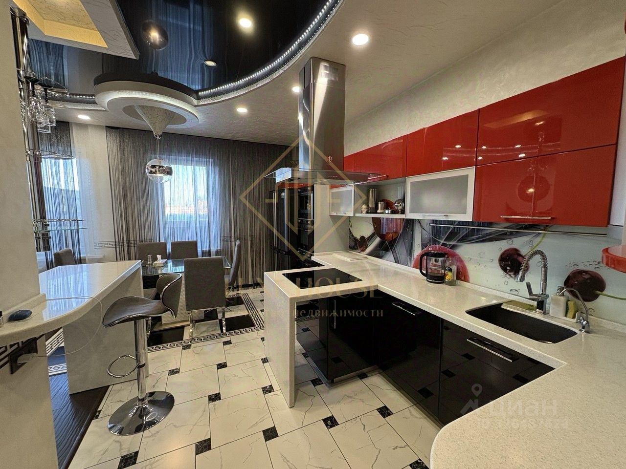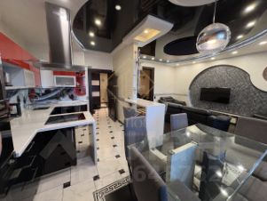 Итальянский керамогранит, венецианская штукатурка с акцентами из сусального золота и серебра, "звездный" натяжной потолок в ванной и стильная мозаика.