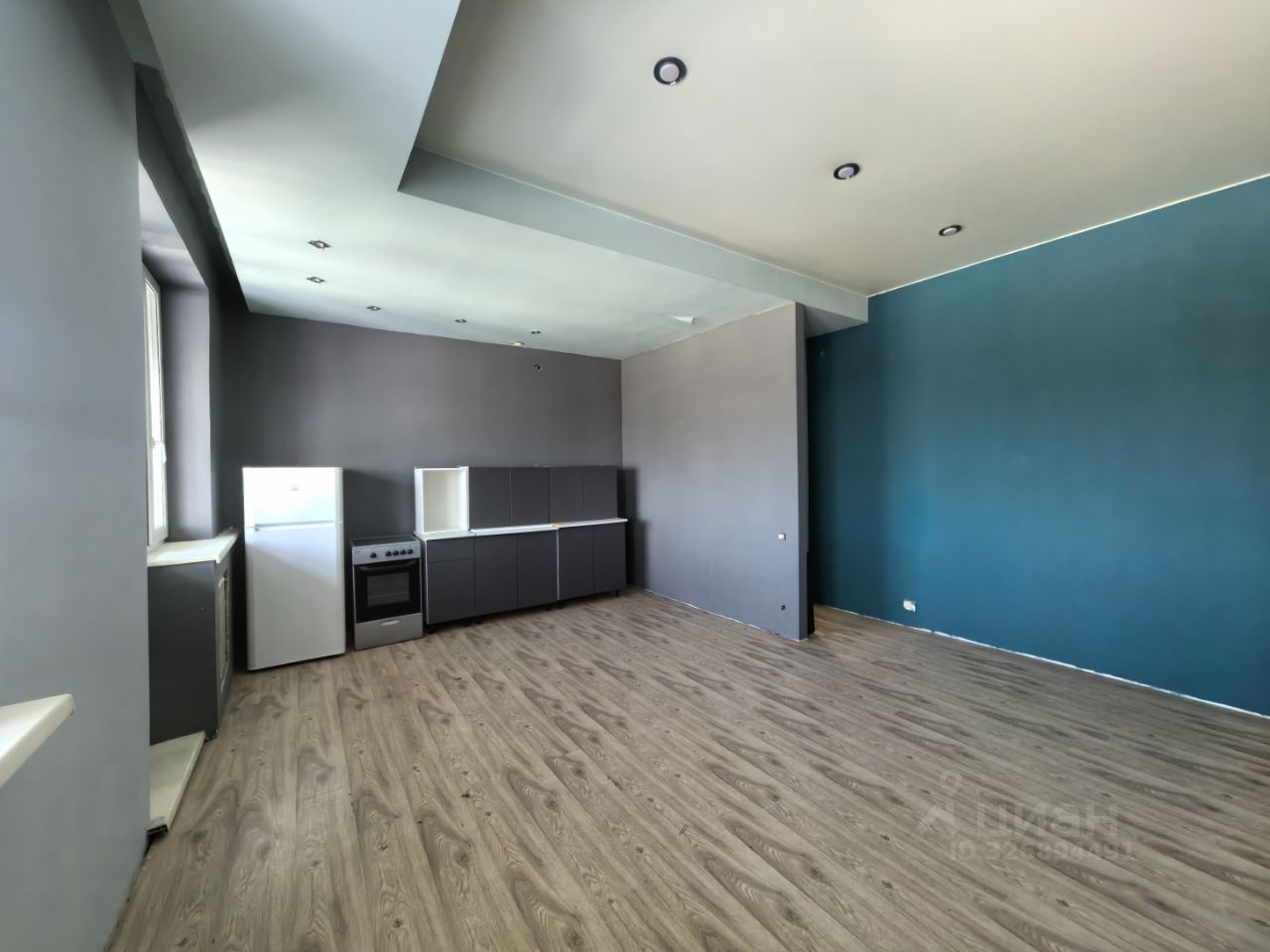 Просторная комната с высокими потолками и двумя большими окнами обеспечит много света и воздуха.