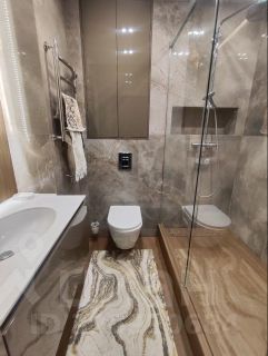 Гардеробная с системой хранения. Санузел совмещен, отделка керамогранит, душевая. Стиральная и сушильная машинка.