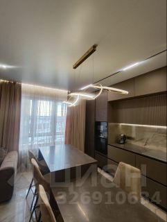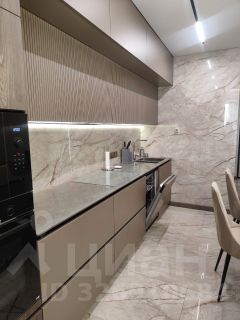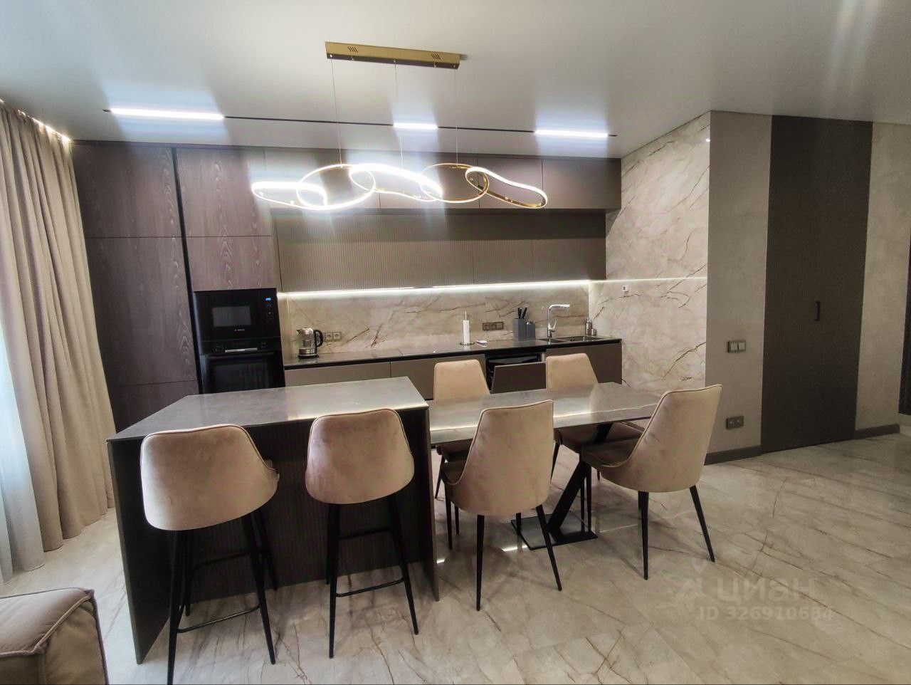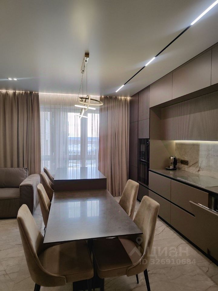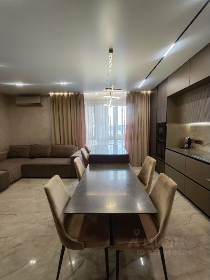 Просторная кухня гостиная укомплектована необходимой мебелью и техникой Воsсh: кухонный гарнитур, варочная панель и духовой шкаф, микроволновая печь, посудомоечная машина, холодильник Liеbhеrr, вытяжка, стол и стулья, большой диван. По всей квартире теплый пол, натяжной потолок с подсветкой.