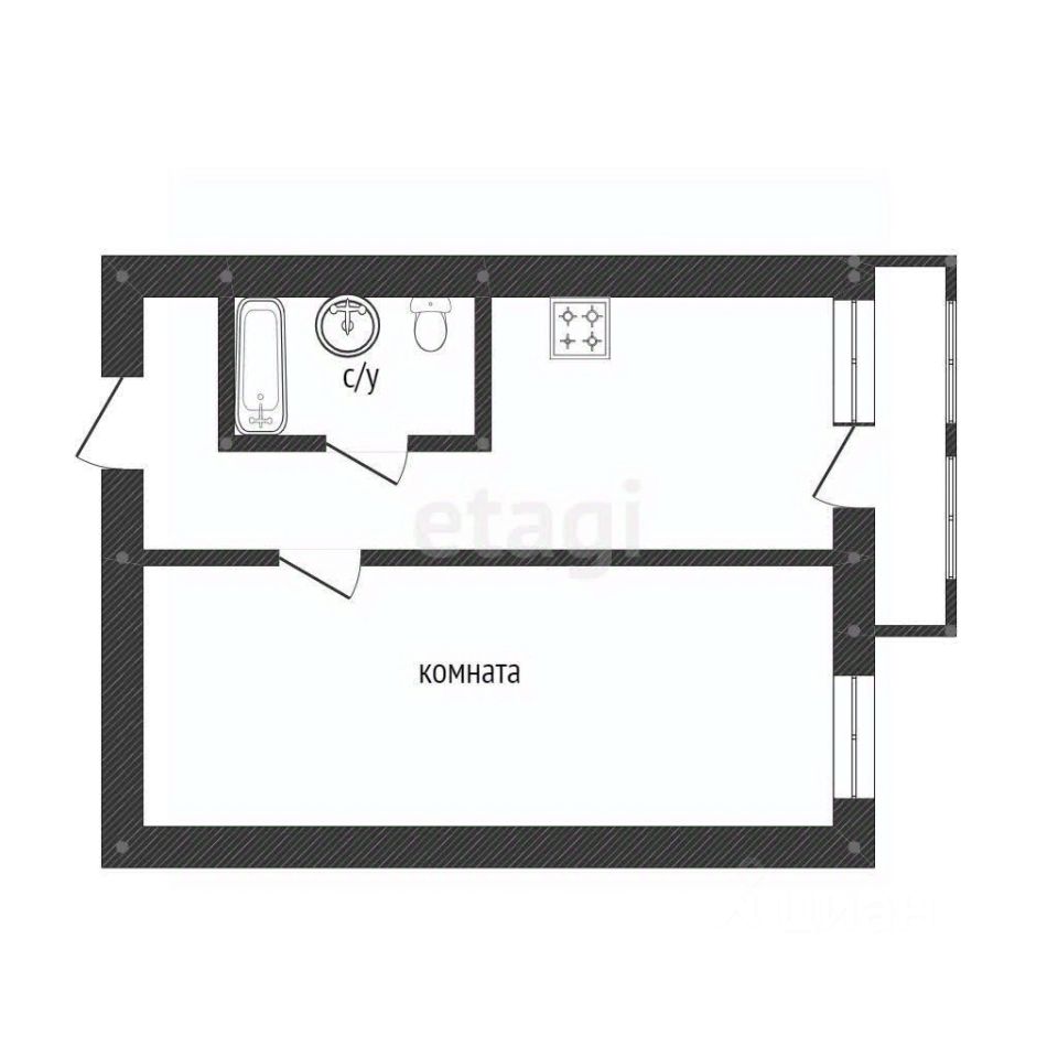 Планировка практична: изолированная комната площадью 19 м², просторная кухня 8 м² и совмещенный санузел.