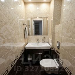 Ванная комната отделана керамогранитом, установлены ванна, биде и системы хранения.
