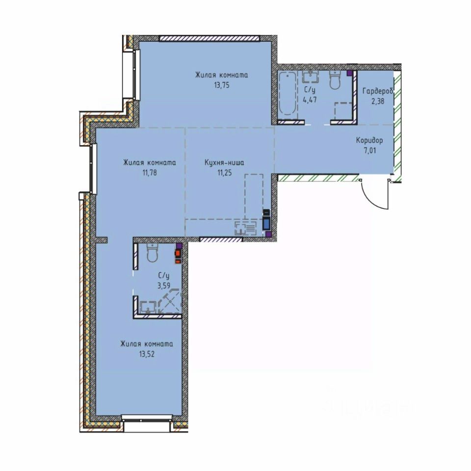 Трёхкомнатная квартира европланировки, расположенная в южной части башни, с окнами на восток и запад отлично подойдёт для семьи из трёх-четырёх человек. В просторном холле предусмотрена установка вместительного гардероба, в который войдёт не только повседневная верхняя одежда и обувь, но и сезонные наряды. Жилые комнаты расположены в разных концах квартиры, чтобы не мешать друг другу отдыхать. Взрослая мастер-спальня предусмотрительно оборудована отдельным санузлом с возможностью установки душевой кабины. Из детской комнаты санузел вынесен ближе к прихожей, чтобы больше места досталось учебной и игровой зоне. Гостиная находится рядом с кухней-нишей и позволяет объединить пространство не только в просторную столовую, но и более чем достаточную зону для совместного вечернего отдыха всей семьёй. Для больших семей предусмотрена возможность объединения с соседней квартирой.