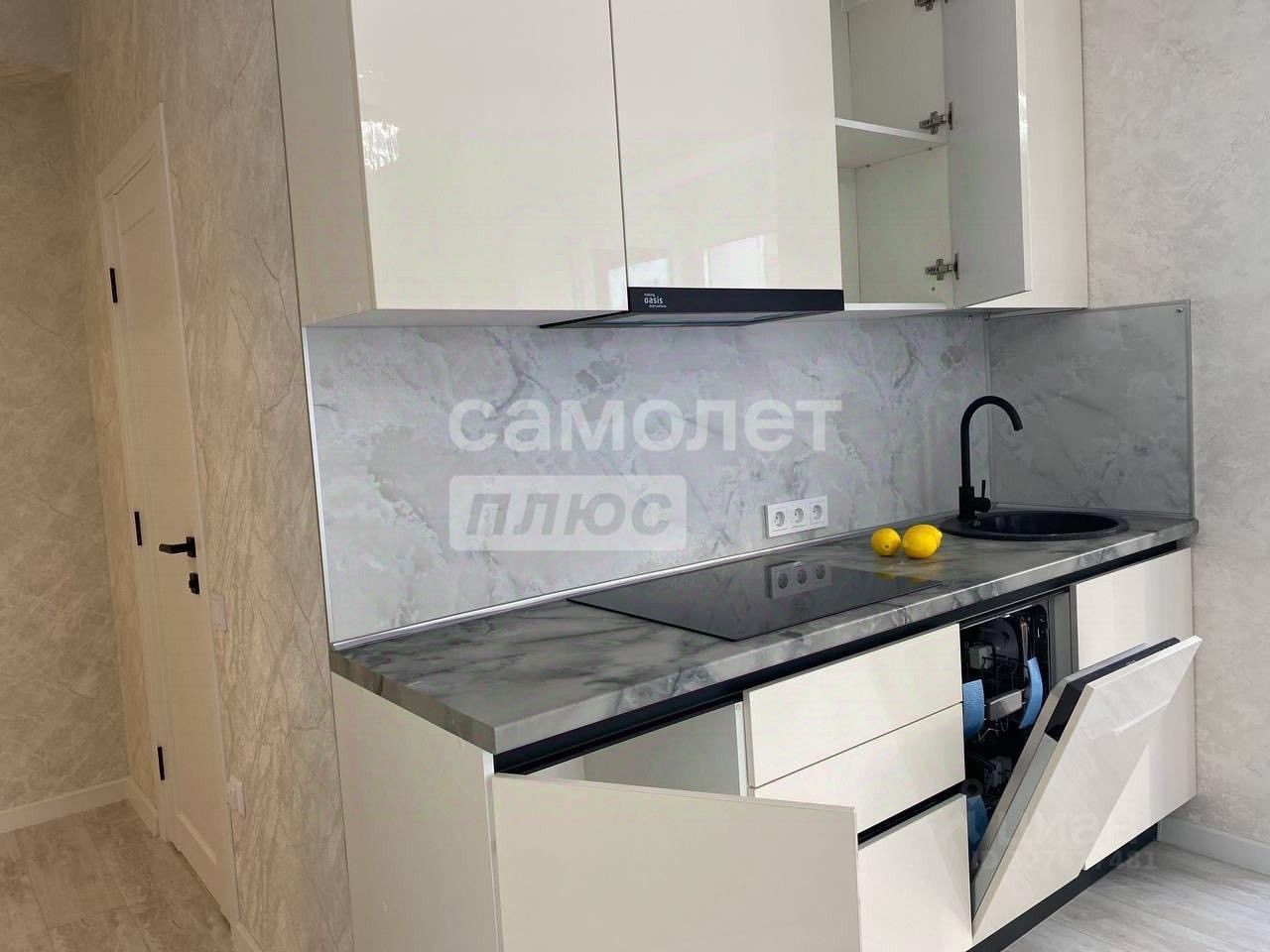 В квартире красивая современная кухня, со встроенной бытовой техникой: варочная панель, духовой шкаф, микроволновая печь, посудомоечная машина,холодильник, вытяжка.