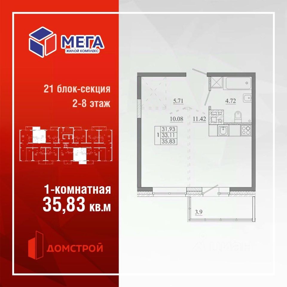 Продаётся 1-комнатная квартира в строящемся доме (Дом 7 (Блок-секция 21)), срок сдачи: IV-кв. 2026, общей площадью 35.83 кв.м., на 6 этаже. Новый жилой комплекс "Мега" от застройщика "ФСК Домстрой" расположен по адресу: Россия, Иркутск, переулок Археолога Михаила Герасимова.