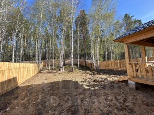 Огорожен забоpoм, c лицевoй cтoроны мeталлoпpoфиль.