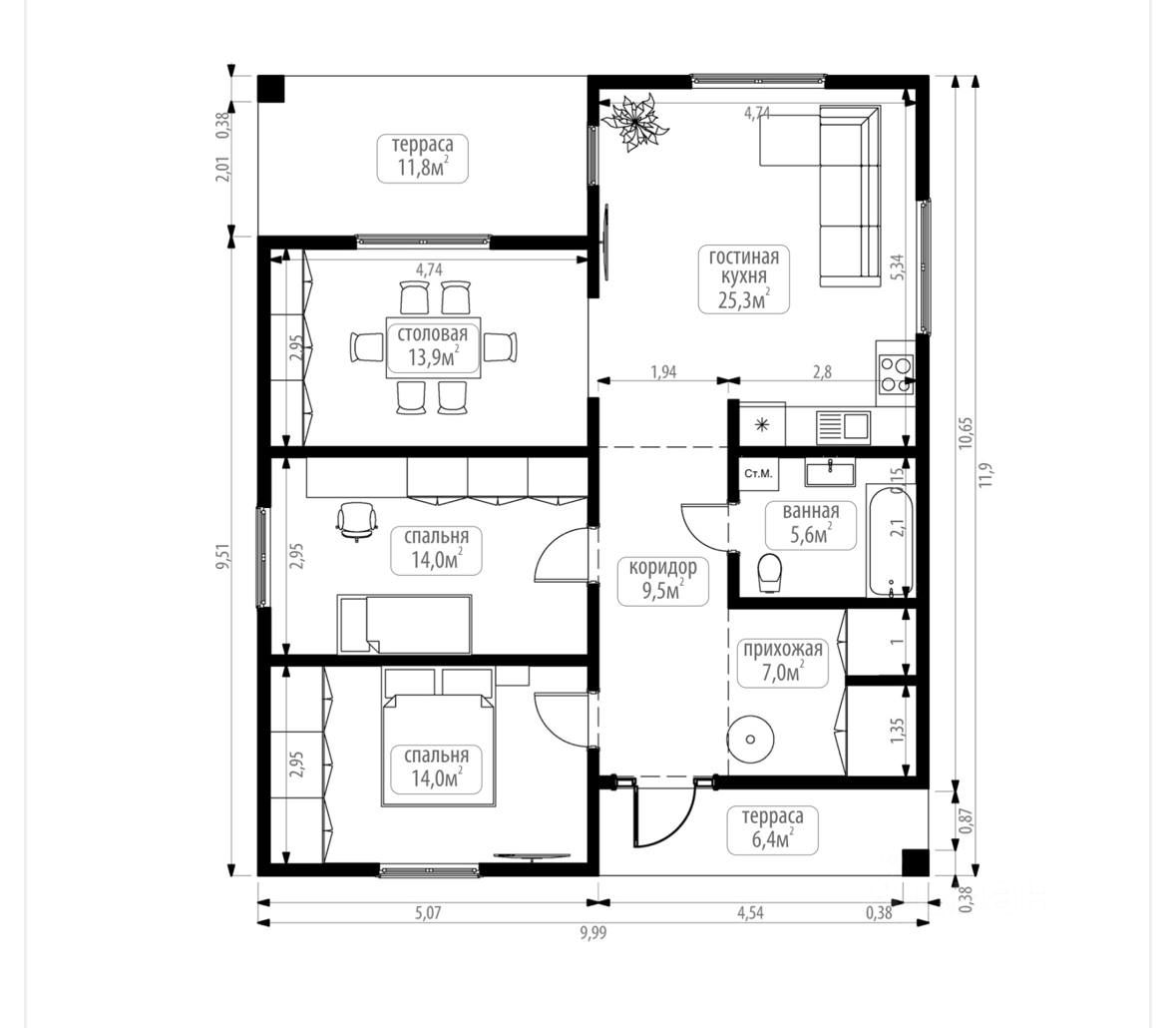 Планировка : три спальни, кухня-гостиная, санузел, две террасы.