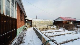Участок разработан, много ягодных кустарников, грядки, парники и небольшое поле для посадки картошки, дорожки выложены плиткой. В огороде стоит летний туалет.