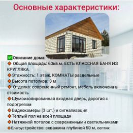 Общая площадь: 60кв.м. ЕСТЬ БАНЯ КЛАССНАЯ ИЗ КРУГЛЯКА.
