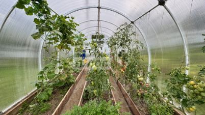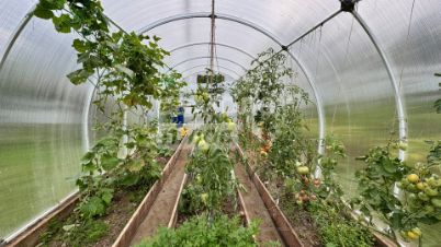Разработанный участок с теплицей из поликарбоната и большим количеством насаждений, а именно: Ирга, яблоня, вишня, малина красная и желтая, клубника, смородина, жимолость.
