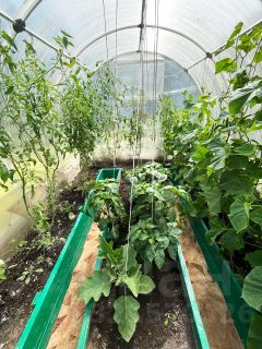 На территории две современные теплицы из поликарбоната (8х3 и 4х3 м), одна на фундаменте, а также хозяйственное помещение и закрытый гараж.