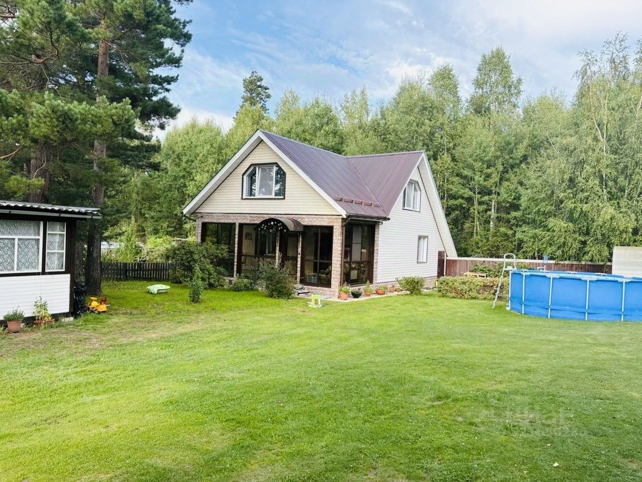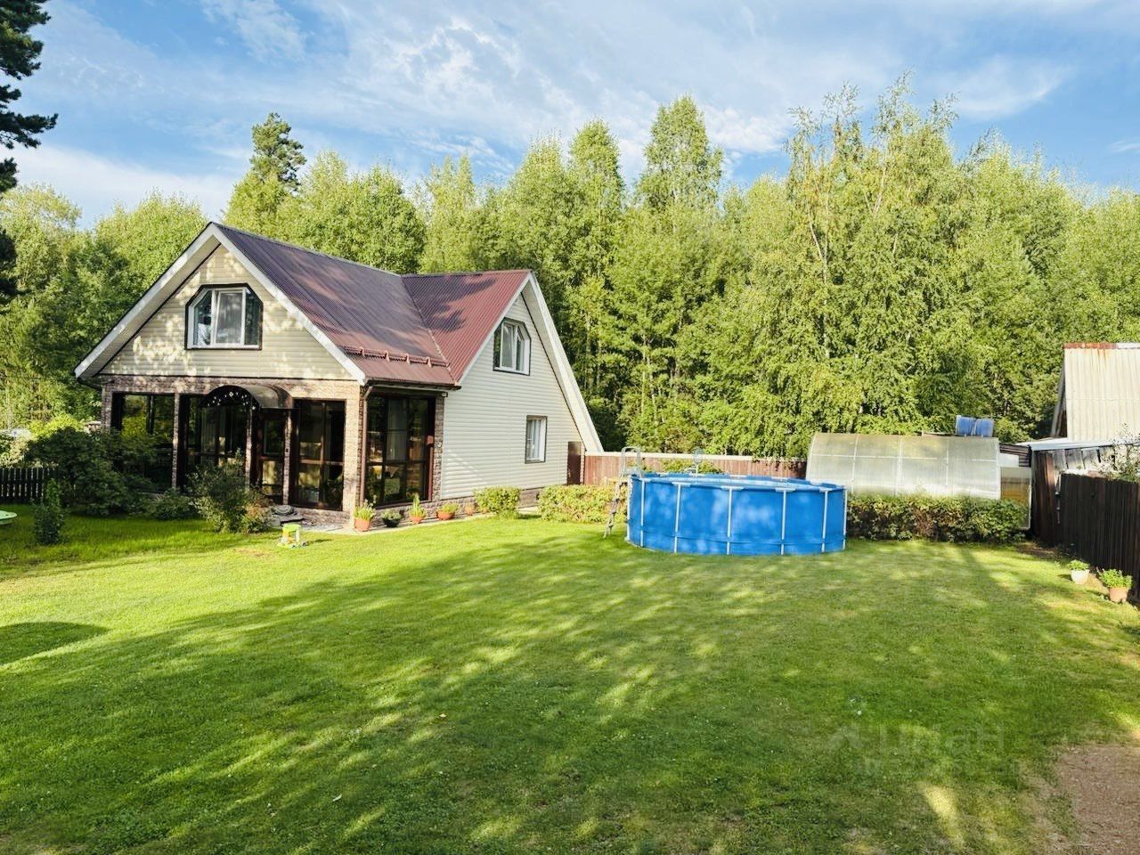 Участок ухожен: газон, площадка для бассейна, зона сада/огорода, теплица, плодовые кустарники
