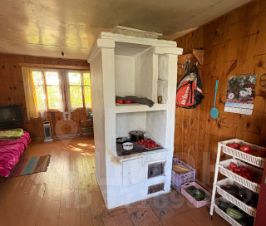 Санузел новый - расположен на улице. В доме сделана чистовая отделка, на потолке крашеное ДВП, на полу доска, хорошая русская печка. Отделка первого этажа выполнена из вагонки, второй мансардный этаж - из лиственницы. В доме есть двухуровневый погреб.