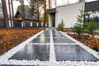 Ухоженная территория закрыта высоким забором с подсветкой.На участке под грунтом уложена дренажная система и продуманная система водоотведения по участку. На бетонном основании выложена красивая брусчатка, а дорожки вокруг дома выложены из натурального гранита и гальтованного мрамора.