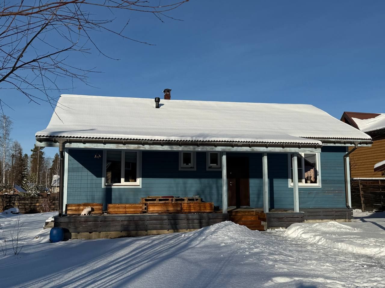 Дом каркасный, 8х12 (жилая площадь 88.3 кв.м.), построен в 2017-18 годах. Утеплен эковатой (пол, потолок) и минеральным утеплителем (стены). Обшит деревянной имитацией бруса, окрашен краской Тиккурила. Крыша Ондулин. Пластиковые окна, трёхслойная дверь с терморазрывом. Просторная терраса.