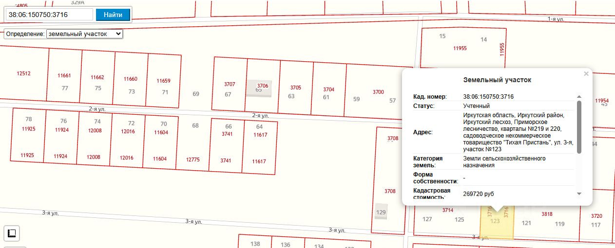 Объект расположен по адресу: Иркутский лесхоз, "Тихая Пристань", ул. 3-я, дом участок 123. Кадастровый номер: 38:06:150750:3716.