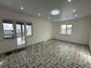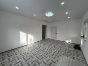 Отделка: натяжные потолки с точечными светильниками, линолеум в комнатах, керамогранит в гостиной и санузле.