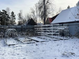 Участок с многолетними насаждениями, есть теплицы, огорожен забором.