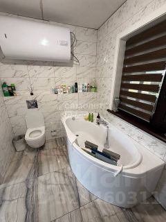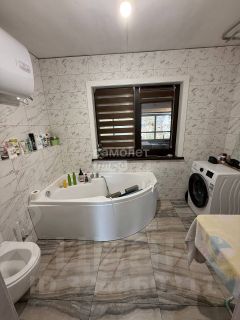 - Просторная и уютная ванная комната с современной отделкой керамической плиткой и новой сантехникой.