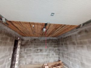 Натяжные потолки с точечным освещением, стены оштукатурены под обои, напольное покрытие - плитка ПВХ, в комнатах - линолеум. Межкомнатные двери. Установлен санфаянс. Сделаны отмостки. Электрические подъёмные ворота в гараже.