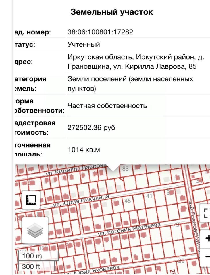 Описание:Кадастровый номер: 38:06:100801:17282Площадь: 11 соток. Участок ровный, правильной квадратной формы.Назначение: Для индивидуального жилищного строительства (ИЖС).Коммуникации: Возможность подключения электричества Локация: Село Грановщина, Иркутский район. Участок расположен в уже сложившемся районе с частной застройкой.Инфраструктура: В 5 минутах ходьбы школа и детский сад. Хорошая транспортная доступность до Иркутска.Состояние: Участок не огорожен, что дает свободу планировки с нуля.Документы: Чистые, готовы к быстрой сделке. Вся информация проверяется по публичной кадастровой карте.Брокер объекта Колоскова Наталья