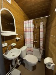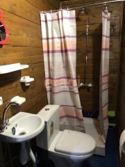 У каждого этажа свой Отдельный вход. На каждом этаже свой с/у. На первом этаже есть душ. В доме две двух-спальные кровати и двух-местный диван. Кухня на 1-м этаже(плита, раковина, холодильник, стол, стулья).