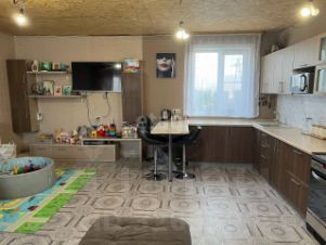 Стены в доме выровнены, в комнатах и гостиной поклеены обои, в прихожей стеновые панели, на полу линолеум. Натяжные потолки в комнатах и прихожей, в гостиной потолок не сделали, планировали открыть второй этаж.