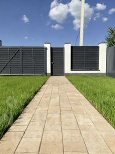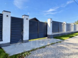 Въездная группа: Электрические откатные ворота R-TECH SL на мощном железобетонном основании с декоративными столбами и освещением.