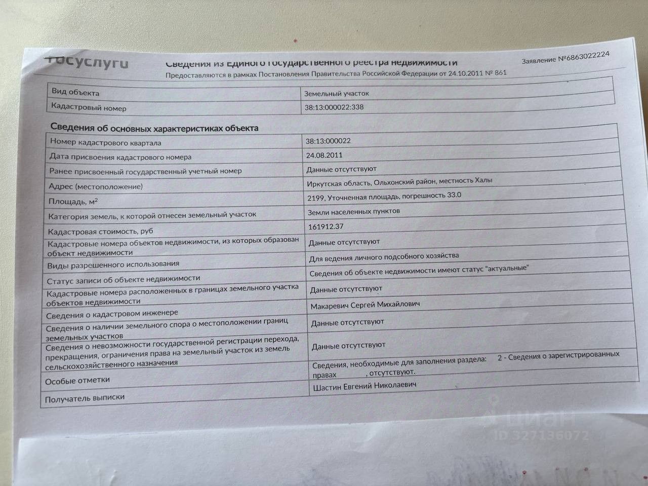 Кадастровый номер: 38:13:000022:338