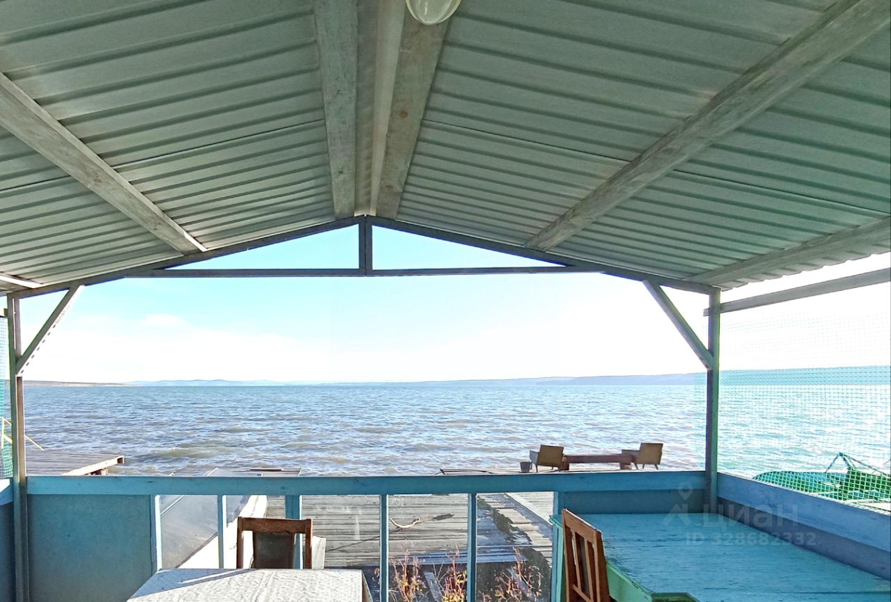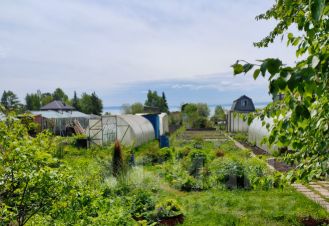 На участке построен садовый домик, баня 2 этажа, беседка на берегу, теплицы.