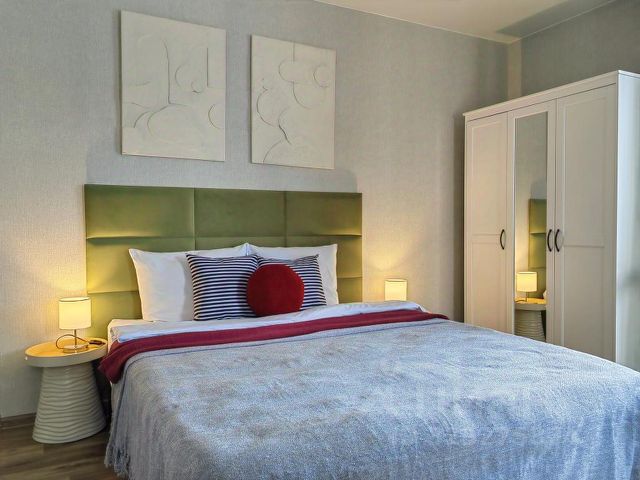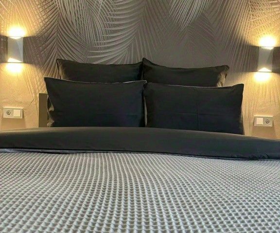 -Удобная двуспальная кровать, тумбочки, настольная лампа, постельное бельё, подушки и одеяла.