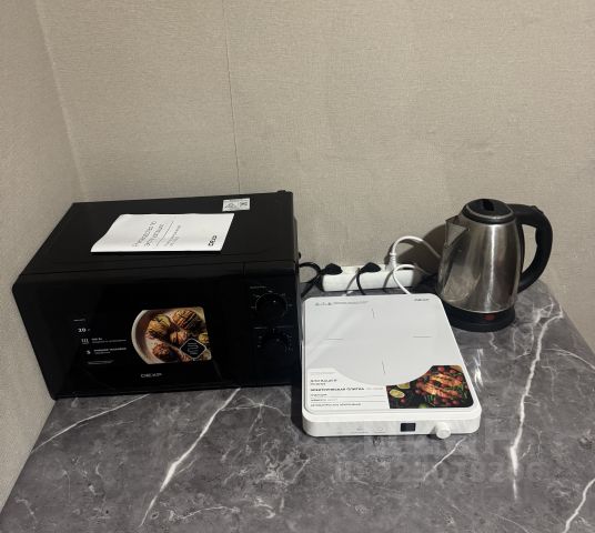 Есть микроволновая печь, посудомоечная машина, чайник/термопот, большая раковина, печь с 2 комфорками с духовкой.