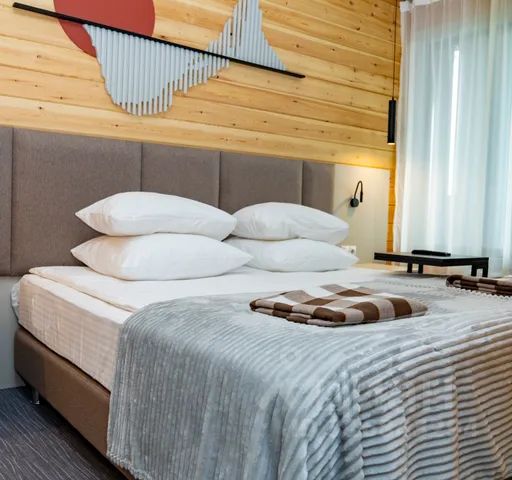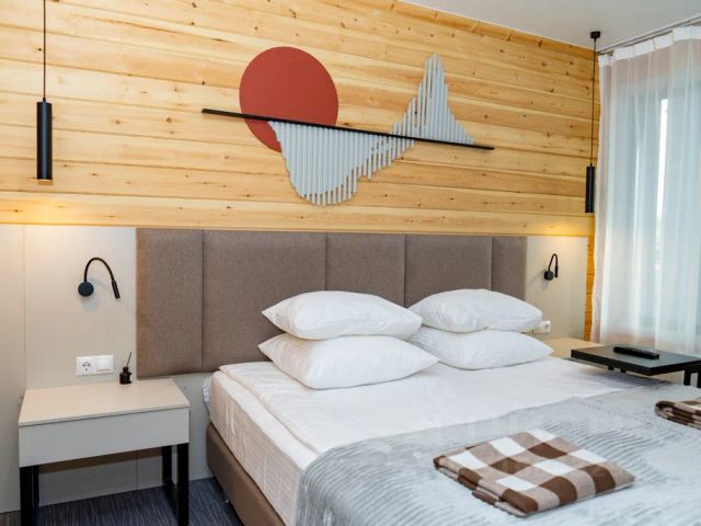 Отель BaikalWood Hotel&Spa расположен в поселке Хужир на острове Ольхон. Рядом с отелем прекрасный сосновый лес, прогулка до пляжа займет около 10 мин. Расстояние до аэропорта Иркутска составляет чуть больше 200 километров. Все номера выполнены в индивидуальном дизайне из экологически чистых материалов. В числе удобств собственная ванная комната с душем и средствами личной гигиены. Из комнат отеля прекрасный вид на Байкал. На территории доступен бесплатный Wi-Fi, также здесь работает ресторан с обширным меню, лаунж бар "Сарай" работает в ночное время, банный комплекс и Spa-комплекс, открытая спортивная площадка, подогреваемый открытый бассейн в летнее время года. Можно заказать экскурсии по острову. Групповые и индивидуальные трансферы. Номер люкс с панорамный видом на озеро Байкал и на лес. В номере: одна двуспальная кровать или две односпальные кровати, телевизор, кофемашина, чайник, чайные пары, халаты, тапочки, принадлежности для душа, холодильник.