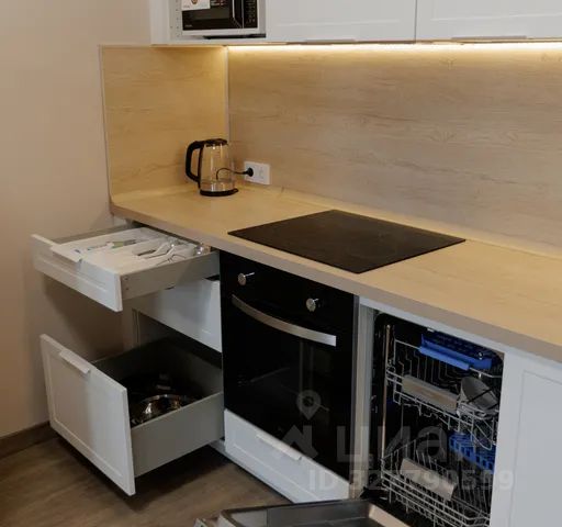 Укомплектованная мебелью и посудой, полноценная кухонная зона с бытовой техникой.